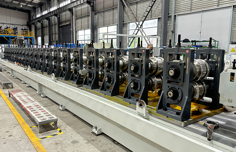 轨道冷弯成型机是由开卷机,矫平机,成型机,PLC电控柜,液压切台,滚筒收料架等设备组成。此设备可以通过快换机组形式可以实现一机可生产多种不同截面不同规格产品。